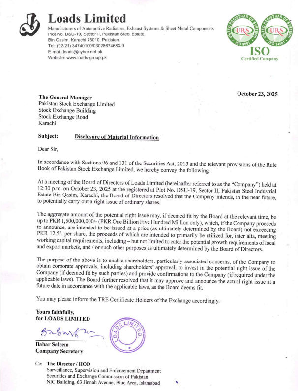 Automotive parts manufacturer Loads Limited has notified the Pakistan Stock Exchange of its plan to raise Rs 1.5 billion through a “rights issue” of shares. The new shares will be offered at a price not exceeding Rs. 12.5 each.