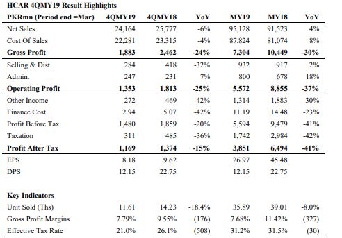 اب آمدنی فی حصص (EPS) دیکھیں تو کمپنی نے مالی سال 2019ء کی چوتھی سہ ماہی میں 8.18 eps رپورٹ کیا ہے جس کے مقابلے میں گزشتہ سال کے اسی عرصے میں یہ 9.62 تھا۔ کمپنی کی خالص فروخت بھی سال بہ سال میں 6 فیصد کم ہوکر 24.16 ارب روپے ہوگئی ہے جو مجموعی فروخت میں 18 فیصد کمی ہے۔