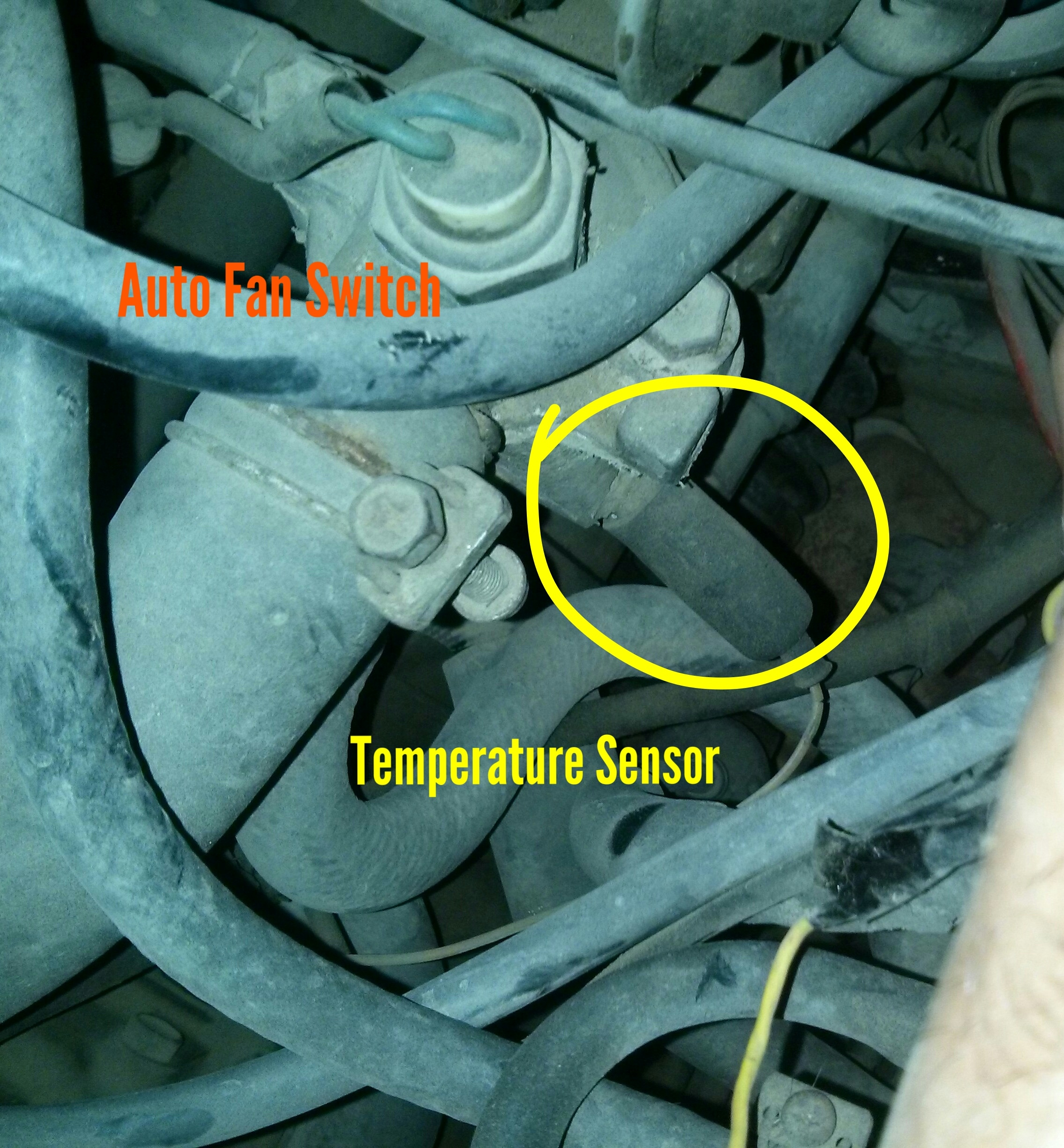 Here it is, yellow one is sensor and orange one is radiator fan switch.